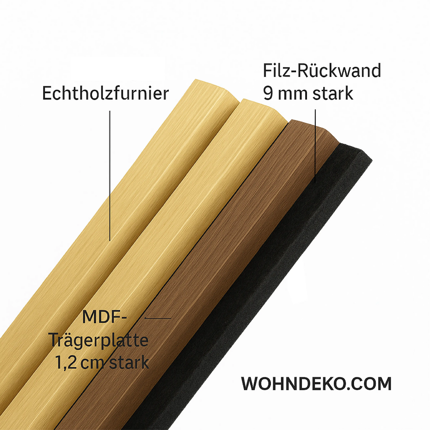 Akustikpaneele aus Echtholz sind die ideale Lösung, wenn du auf der Suche nach einer stilvollen und zugleich funktionalen Wandverkleidung bist. Bei Wohndeko.com bieten wir dir eine breite Auswahl an hochwertigen Akustikpaneelen, die nicht nur durch ihr natürliches Design beeindrucken, sondern auch die Raumakustik in deinen Wohn- oder Arbeitsräumen nachhaltig verbessern. Entdecke, wie du mit unseren Echtholz-Paneelen eine harmonische Atmosphäre schaffen und gleichzeitig die akustischen Eigenschaften deines Raumes optimieren kannst.